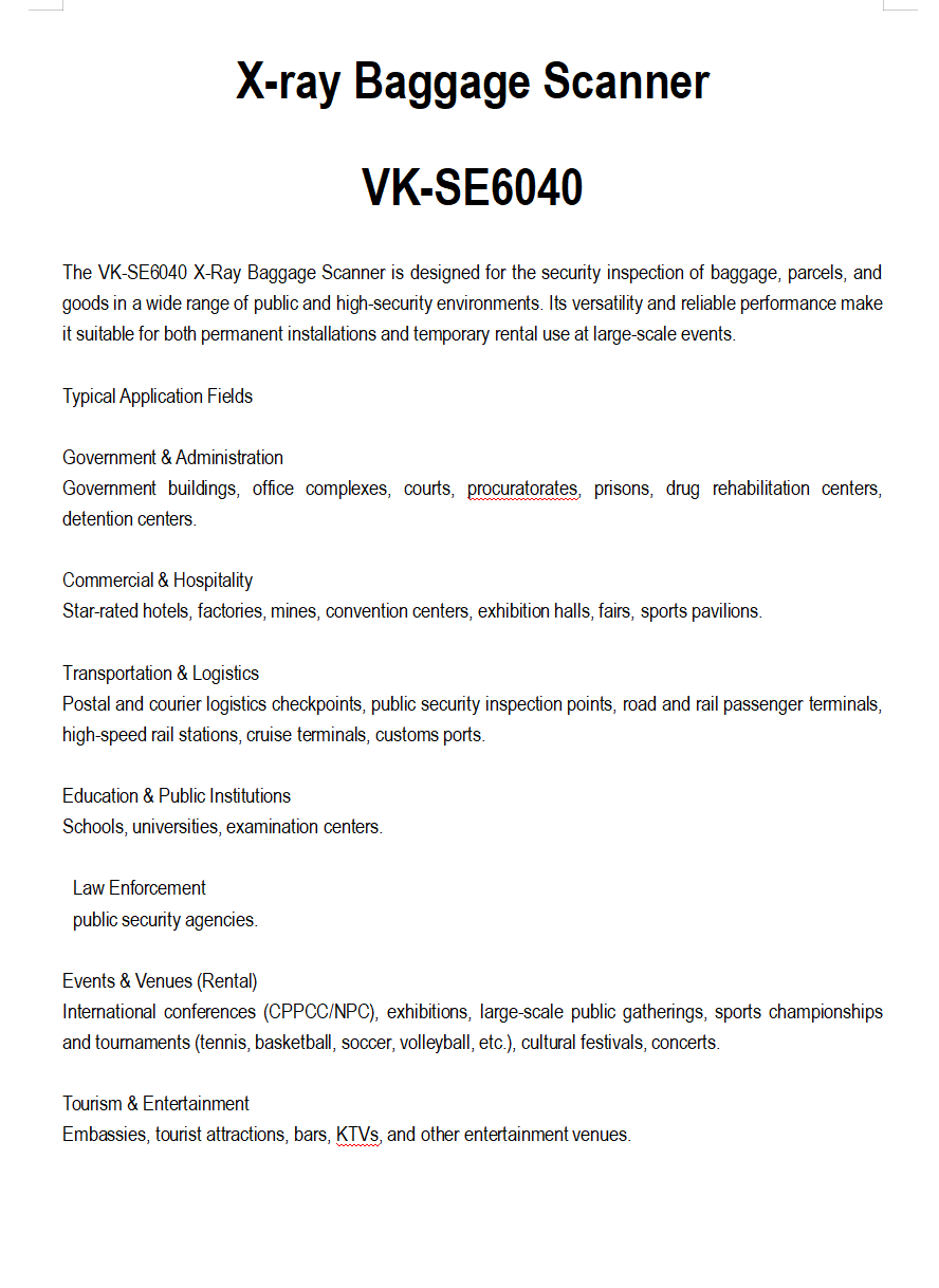The Viking VK-SE6040 X-ray Baggage Scanner offers precise material identification and threat detection. This scanner is suitable for a wide range of environments, including but not limited to airports, government buildings, prisons, and sports venues. It is not only cost-effective but also provides the same level of security as professional inspection equipment from other global brands. With its high penetration and flexible deployment, no other mid-sized X-ray scanner on the market can offer such versatility.